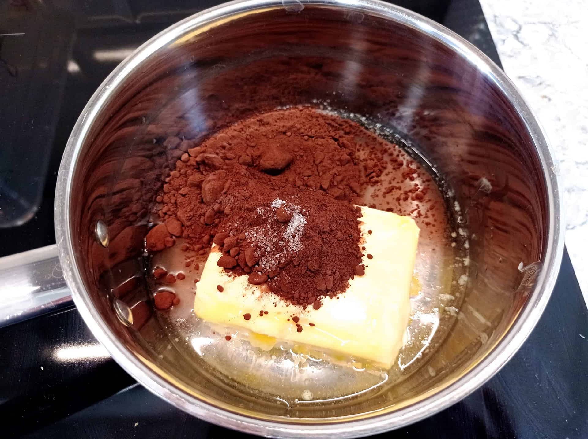 - En una olla pequeña, combina la mantequilla, el cacao en polvo, la sal y el agua y colócalo a fuego medio. Cocina revolviendo hasta que se derrita y se combine. Sácalo del fuego y déjalo enfriar 10 minutos.