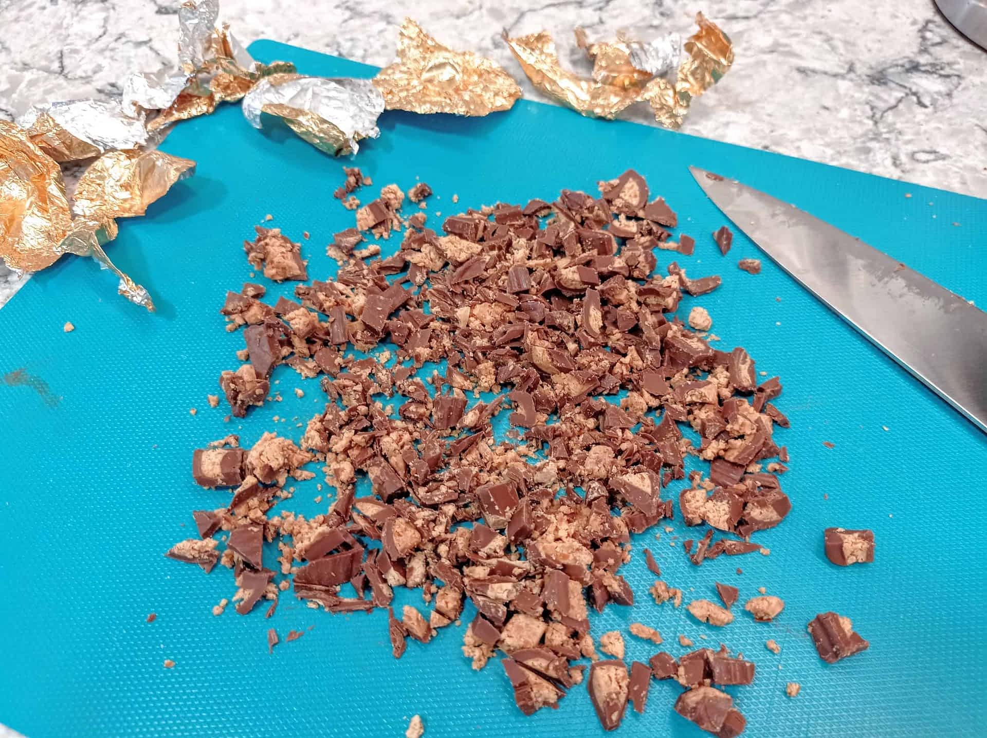 - Opcionalmente, cortar chocolates rellenos de mantequilla de maní, o cacahuetes, para decorar la tarta de queso.