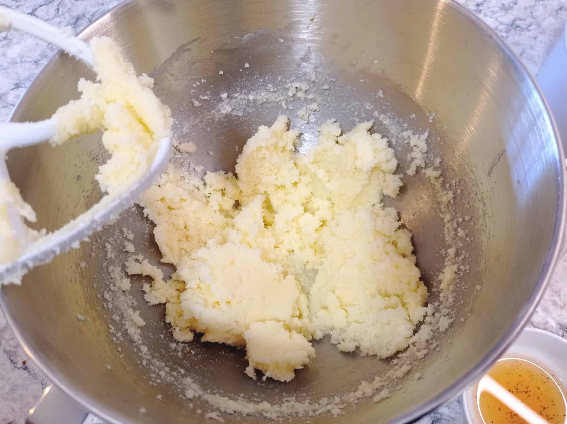 - En el tazón de una batidora de pie equipada con el accesorio de paleta, o en un tazón grande con una batidora eléctrica, mezclar la mantequilla y el azúcar a velocidad media durante 4-5 minutos.