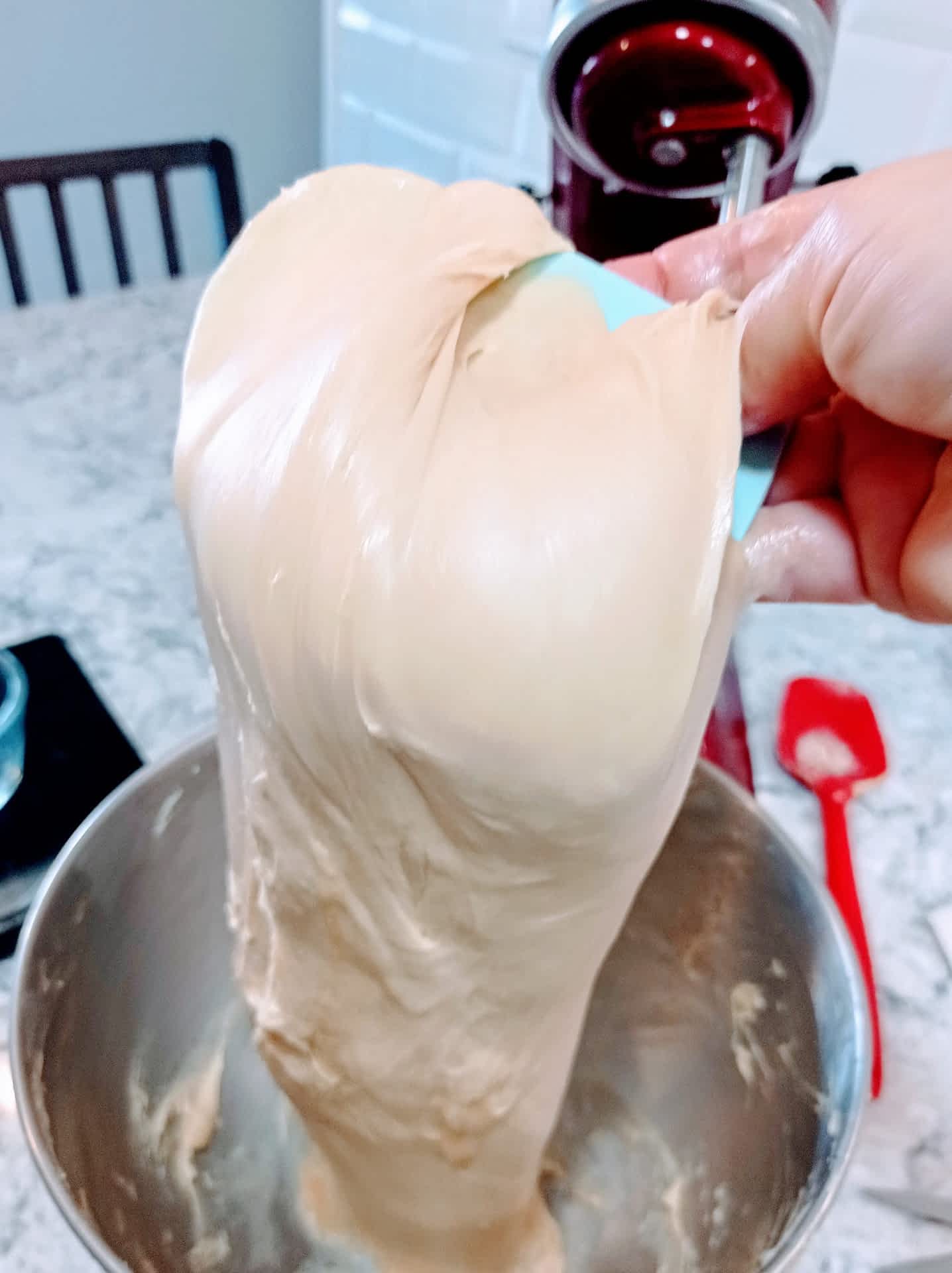 - Mezcla todos los ingredientes hasta que la masa esté suave y brillante. Esto llevará un tiempo y, aunque se puede hacer a mano, realmente deseas hacerlo con una batidora. Yo mezclo esta masa durante unos 14 minutos a velocidad baja-media. ¡La masa resultante es bastante espectacular!