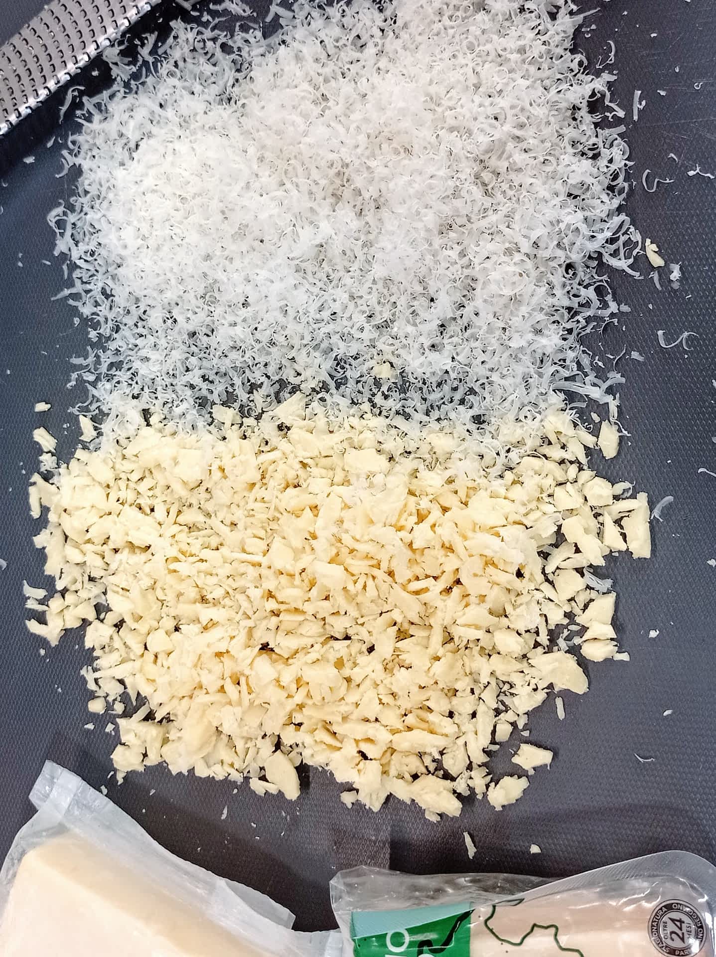 - Queso: De verdad puedes usar cualquier tipo de queso que te guste, ¡solo asegúrate de poner una buena cantidad! También recomiendo mezclar dos quesos para aportar cierto sabor interesante. Tenemos un queso cheddar favorito que uso, y también le pongo parmesano para la explosión de sabor.