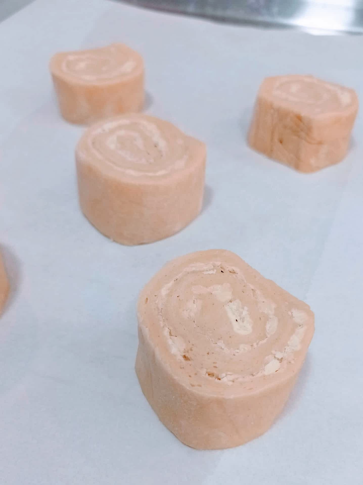 - Enfría otra vez. En este punto, es probable que la masa se haya calentado un poco. Puedes seguir y cortar los rollos y colocarlos en la bandeja. O puedes envolver el rollo con cuidado en plástico o papel de horno y colocarlo plano en el congelador. La masa será mucho más fácil de cortar cuando esté muy fría y mantendrá su forma redonda.