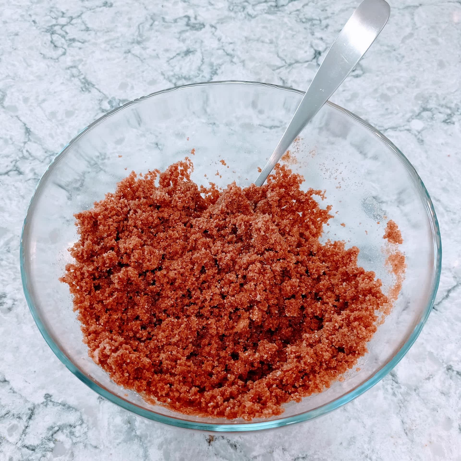 - En un tazón mediano, revuelve las migas de galletas junto con el azúcar y la mantequilla derretida hasta que estén bien incorporadas y la mezcla parezca arena húmeda. Con la base de un vaso, presiona la mezcla en el fondo y hasta la mitad de los lados de un molde desmontable de 20-25cm.